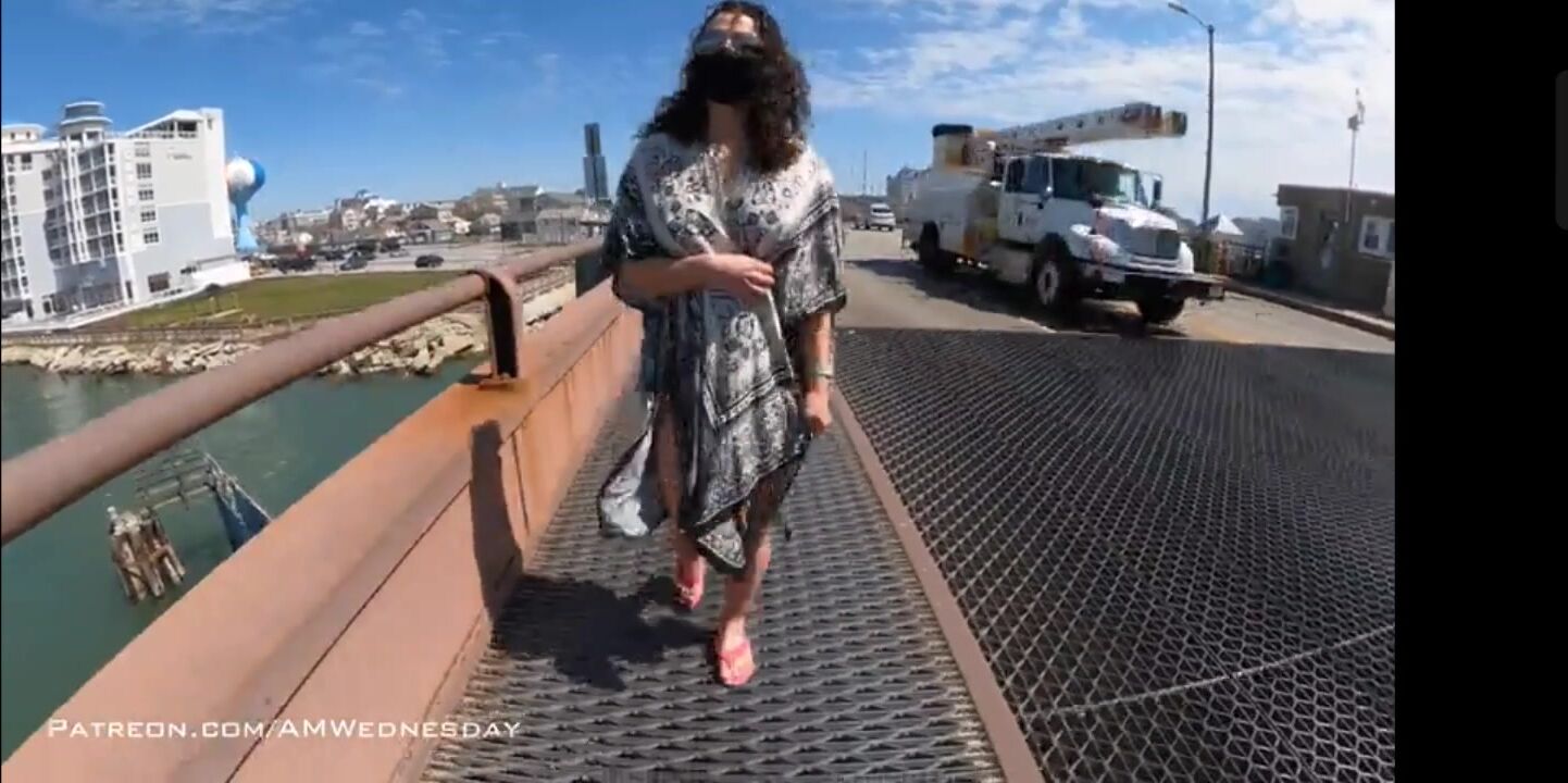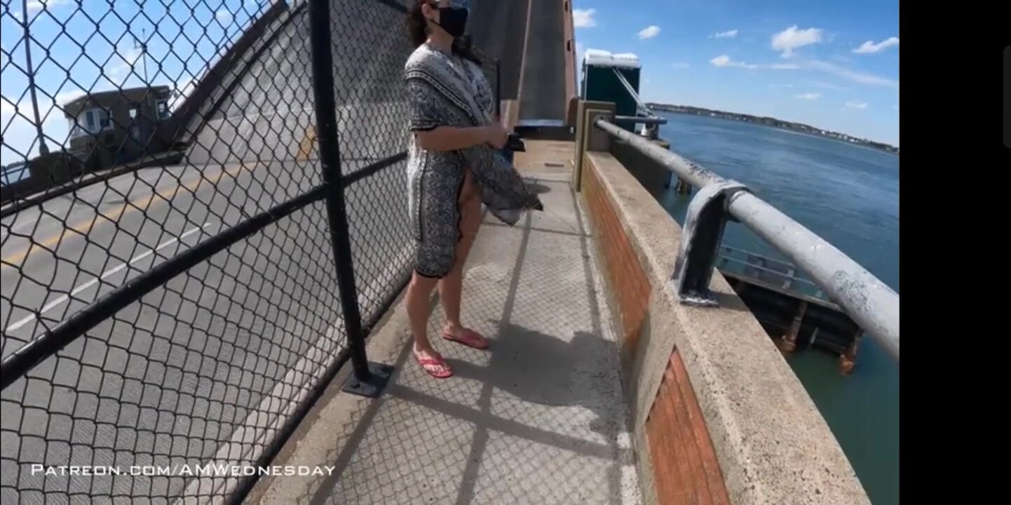 walking and flashing on a busy bridge